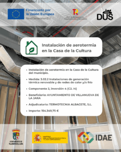 En la Casa de la Cultura del municipio de Villanueva de la Jara ubicado en la Calle Viñas 1, de uso cultural, se ha planteado como actuación la sustitución de carpinterías existentes metálicas SRPT con vidrio simple, por cerramientos más eficientes, compuestos de carpintería de PVC y doble vidrios bajo-emisivos.
