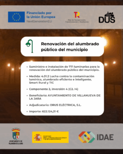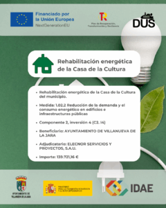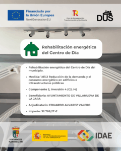 La obra ejecutada ha consistido la reducción de la demanda y el consumo energético en el Centro de Día del municipio de Villanueva de la Jara ubicado en la Plaza San Francisco 1, de uso cultural. Se ha planteado como actuación la sustitución de lámparas/luminarias existentes de tecnología convencional por lámparas/luminarias con tecnología LED, teniendo en cuenta, además, la incorporación de un sistema de control y regulación de éstas que permitan un funcionamiento más eficiente de las mismas.